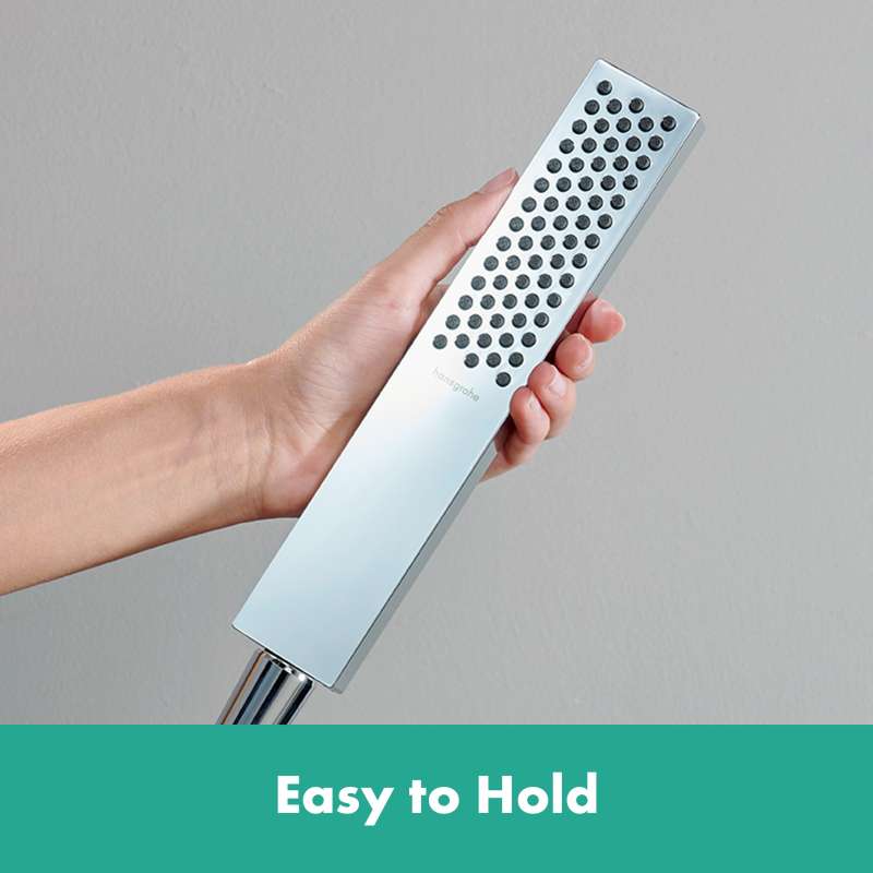 A boost of freshness for individualists: Designer shower head Pulsify E in chrome with PowderRain With the Pulsify E 100 1-spray hand shower hansgrohe ensures invigorating refreshment in the shower. The unique hansgrohe PowderRain jet type wraps your body in the finest water droplets and refreshes - whether in the morning for a burst of energy or during a relaxing shower after a busy day. The striking minimalist shape of the shower head draws attention and is a natural choice for personalised bathroom design. These products are available in different coloured finishes, ranging from polished chrome, Matte black, and a classic brushed nickel finish.
