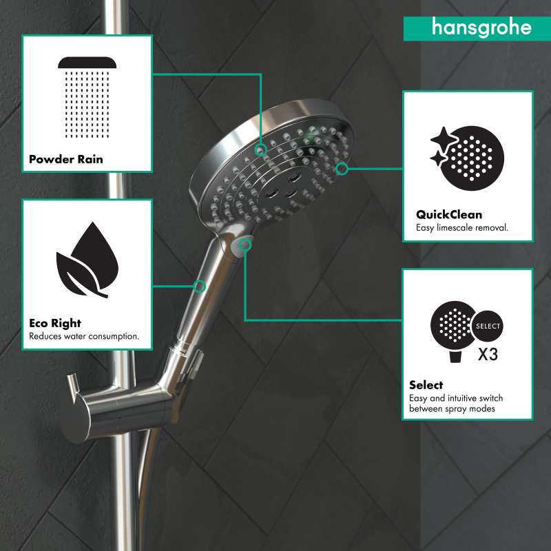 - Limescale can be easily wiped off the silicone nozzles on the shower head (QuickClean).