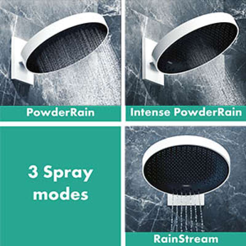 - Lots of variety: This handshower features 3 sprays: PowderRain - a luxurious rain shower that evelops you in a soft spray, Intense PowderRain - an invigorating spray of fine droplets tha helps wake you up in the morning, and RainStream - a focused jet for a soothing, feel-good shower.