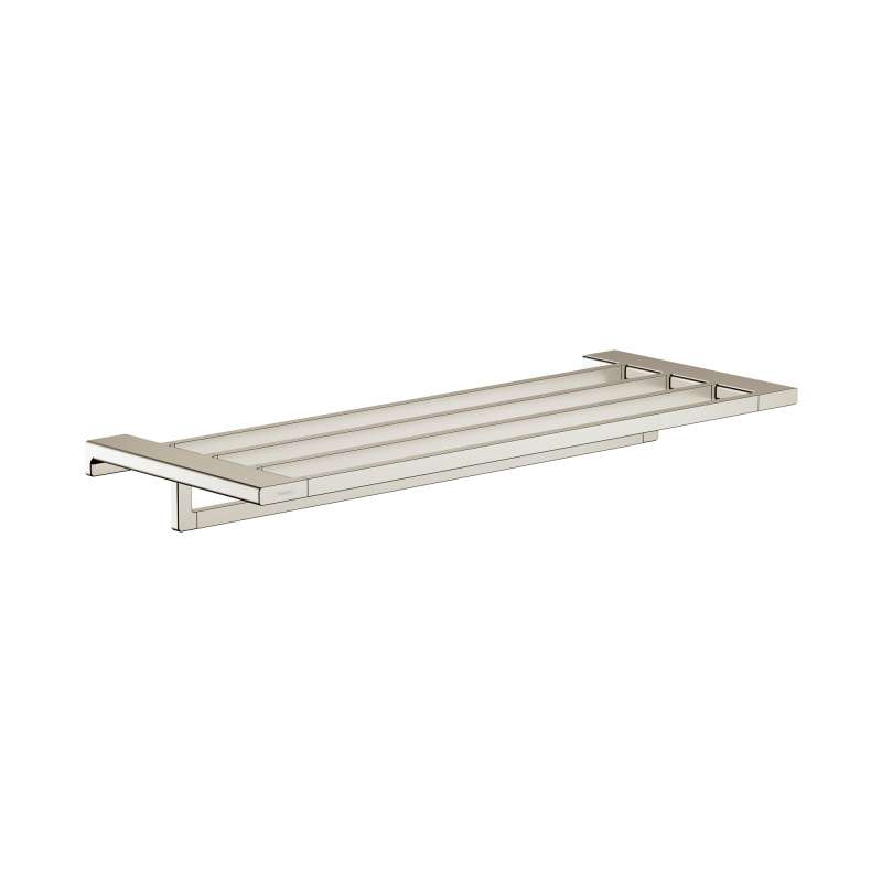 Attractive towel rack for wall mounting with towel rail in polished nickel. With the AddStoris towel rack from hansgrohe the bathroom is both functional and visually enhanced. On the approx. 25.5 in wide and approx. 9.8 in deep shelf allows you to store towels to save space. On the holder underneath, a towel is always at hand and quickly dried. The modern and reduced design impresses with a clear, expressive design. It fits particularly well with geometric bathroom fittings, such as the hansgrohe line Metropol. Nice that the hansgrohe quality keeps what the high-quality design promises: the AddStoris towel rack is made of metal and therefore particularly durable. This helps in the sustainable use of resources and reduces the plastic content in the environment. The polished surface in brushed nickel is Easy to clean. It corresponds to the color of the hansgrohe special surfaces for fittings (FinishPlus). So everything fits perfectly together. Easy to install. The towel rack is reliably attached to the wall by a total of four screws. The drilling distance on both sides is 0.9 in each.