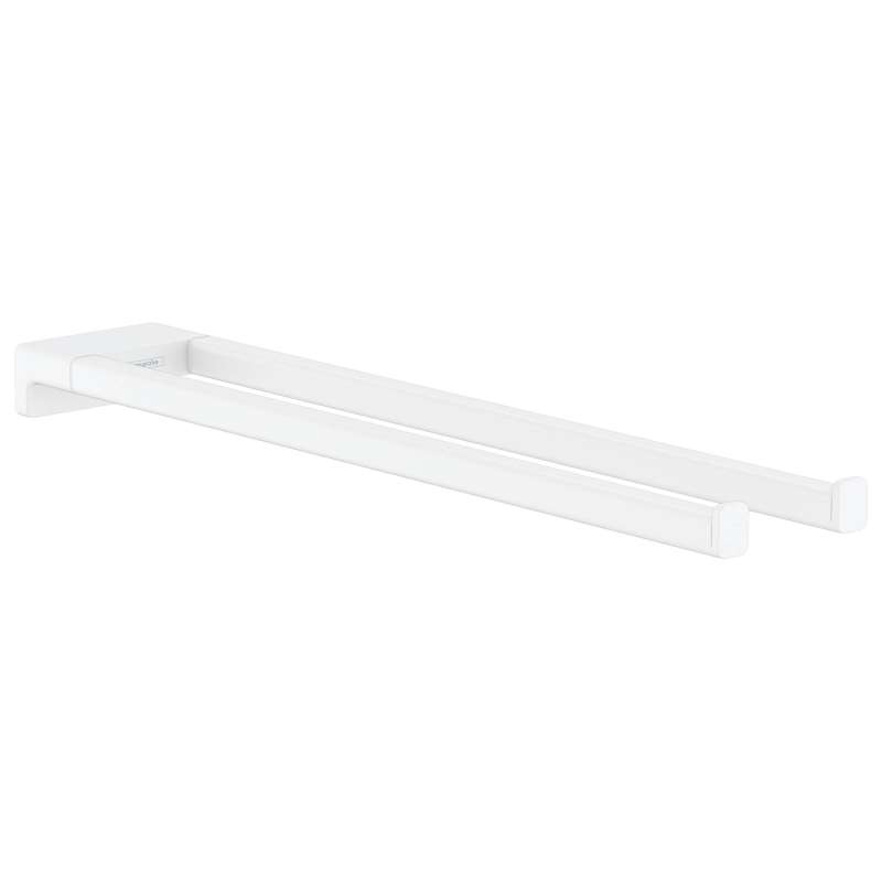 hansgrohe Wall Mounted Double Arm Towel Rail in Matte White With the AddStoris towel rail from hansgrohe the bathroom is both functional and visually enhanced. On the approx. 17.5 in long and 3.2 in wide holders, two towels are always at hand and quickly dried. The modern and reduced design impresses with a clear, expressive design. It fits particularly well with geometric bathroom fittings, such as the hansgrohe line Metropol. Nice that the hansgrohe quality keeps what the high-quality design promises: the AddStoris towel rail is made of metal and therefore particularly durable. This helps in the sustainable use of resources and reduces the plastic content in the environment. The matte surface in matte white is easy to clean. It corresponds to the color of the hansgrohe special surfaces for fittings (FinishPlus). So everything fits perfectly together. Easy to install. The towel rail is reliably attached to the wall with two screws. The drilling distance is 0.9 in. Thanks to the rigid design of the two rods, the attachment remains stable for a long time.