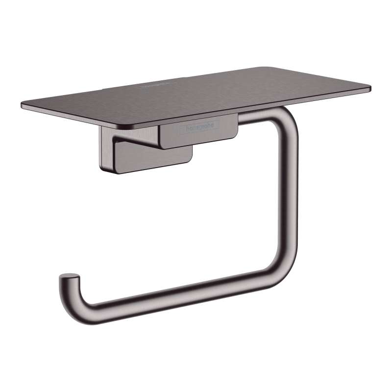 hansgrohe Toilet Roll Holder with Shelf in Brushed Black Chrome With the AddStoris toilet roll holder from hansgrohe the bathroom is both functional and visually enhanced. The elegant holder keeps the toilet roll always at hand and also offers a practical shelf. The modern and reduced design impresses with a clear, expressive design. It fits particularly well with geometric bathroom fittings, such as the hansgrohe line Metropol. Nice that the hansgrohe quality keeps what the high-quality design promises: the AddStoris toilet roll holder is made of metal and therefore particularly durable. This helps in the sustainable use of resources and reduces the plastic content in the environment. The brushed surface in brushed black chrome is easy to clean. It corresponds to the color of the hansgrohe special surfaces for fittings (FinishPlus). So everything fits perfectly together. Easy to install. The toilet roll holder is reliably attached to the wall with two screws. The drilling distance is 0.9 in.