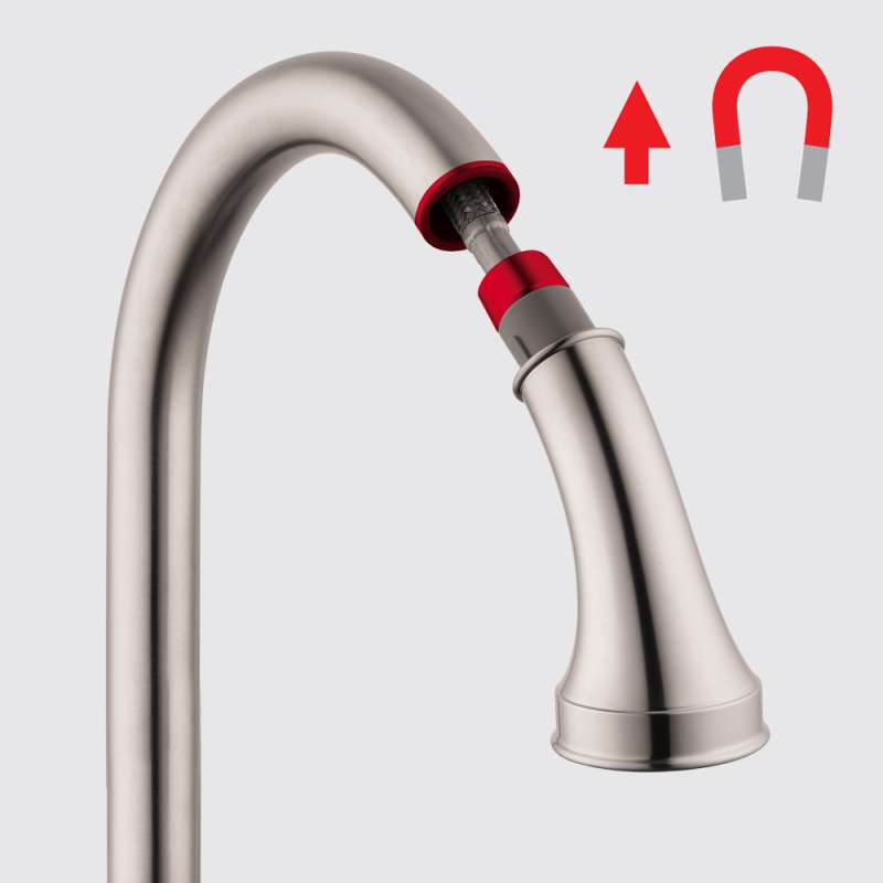- Magnetic holder: the pull-out shower head is held securely and in the middle of the spout (hansgrohe MagFit)
