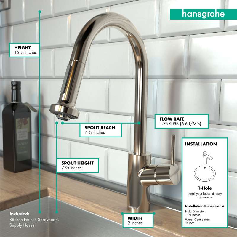 Design With a range of models and styles, paired with the quality and design you expect from hansgrohe, dream kitchens become a reality. Kitchen faucets by hansgrohe exude beautiful design, superior durability, and unique features that are intuitive to use. Pick your desired faucet, then browse the entire product suite for complementary fixtures. German engineering ensures a lifetime of consistent and dependable operation. Maintenance Products that function perfectly are essential. To ensure that they do, every hansgrohe kitchen faucet is 100% air-tested in production. The silicone aerator and spray nozzles help optimize water flow performance, resist mineral deposit build-up, and are designed to be easily wiped clean. Installation Can be installed over existing multi-hole counter configurations. Standard 3/8-inch pipe connection hoses included. Baseplate sold separately. Please comply with all local, state, and federal plumbing codes and regulations. Installation instruction link below. Customer Support customerservice@hansgrohe.com | 1 (800) 334-0455 | Limited Lifetime Warranty | Installation / User Guide / Warranty PDF links below