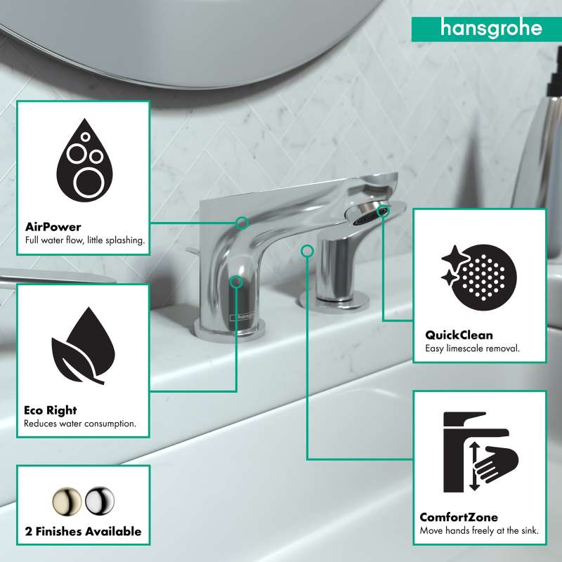 This harmoniously designed, durable and visually strong bathroom faucet from the Focus line combines all hansgrohe quality features in one product: in shiny chrome, with a dynamic silhouette and gentle curves, the faucet features three extremely practical hansgrohe technologies: EcoSmart, QuickClean and AirPower. This harmoniously designed, durable and visually strong bathoom faucet from the Focus line combines all hansgrohe quality features into one product: in shiny chrome, with a dynamic silhouette and gentle curves, the faucet features three useful hansgrohe technologies. The single handle controls a high-quality ceramic valve from hansgrohe. The amount and temperature of the water are reliably adjusted. The soft air-infused spray continues the slim fitting body and forms a harmonious unit. Thanks to hansgrohe EcoRight technology, the faucet helps save water. It uses a maximum of 1.2 GPM - even at high water pressure