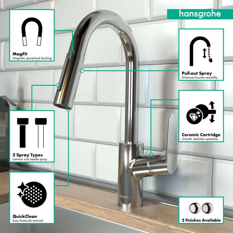 Focus range kitchen faucets combines aesthetics and practicality. They offer a wide range of combination options and blend in perfectly in modern kitchens with straight, clear lines. Depending on the color of the oven, fridge, extractor hood or handles in your kitchen: The finish in chrome or optional scratch-resistant stainless-steel look fits into any setting. The high spouts create a lot of space between the faucet and sink. In the Focus range, you will find models with high swivel spouts; adjustable in three levels of 110 deg, 150 deg and 360 deg. Enjoy the added comfort that the Focus kitchen faucet with hand spray brings with it. With these practical faucet extensions, you are provided with two different spray modes that you can change at the touch of a button: normal and shower spray. The normal spray fills pots and pans accurately and quickly. The wide shower spray is used to wash vegetables, salad, fish and meat thoroughly. The ergonomic handle is particularly Easy to use.