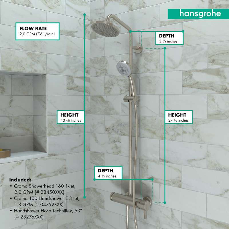 - ALL-IN-ONE SHOWERPIPE: Includes Croma 160 1-spray Showerhead, Croma E 100 Green 3-spray Handshower, 63-inch Hose, Croma Showerpipe (required basic rough set 16181181 sold separately)
