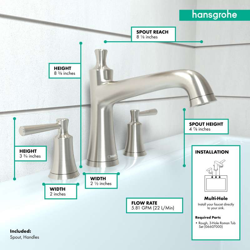 Whether you're starting your day with a shower or winding down with a hot soak, Joleena will elevate the experience and seamlessly weave it in with the rest of your day. The Joleena 3-Hole Tub Filler perfectly coordinates with the entire Joleena bath and shower collection. It requires the hansgrohe Rough for 3-Hole Roman Tub Sets (06607000) for installation in your bathroom. Transform your bathroom into a cleaner and more polished part of your home with the Joleena Collection by hansgrohe.