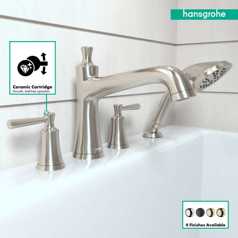 Whether you're starting your day with a shower or winding down with a hot soak, Joleena will elevate the experience and seamlessly weave it in with the rest of your day. The Joleena 4-Hole Tub Filler perfectly coordinates with the entire Joleena bath and shower collection. The tub filler features a coordinating handshower with a 1.75 GPM flow rate, making it compatible with low-flow regulations. The handshower has a single Spray mode: Full, which is perfect for washing off daily stress at the end of the day. It requires the hansgrohe Rough for 3-Hole Roman Tub Sets (06646000) for installation in your bathroom. Transform your bathroom into a cleaner and more polished part of your home with the Joleena Collection by hansgrohe.
