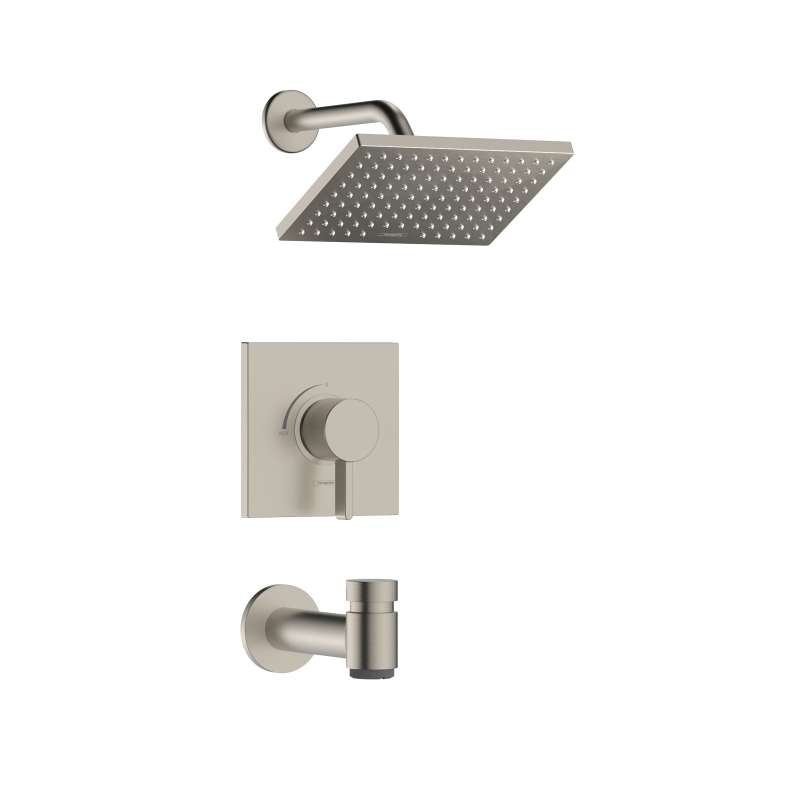 - Included pieces: Vernis Shape 2.5 GPM 1-Jet Showerhead, 9-inch Showerarm, Ecostat Square Pressure Balance Shower Trim, and Metris S Tub Spout with Diverter