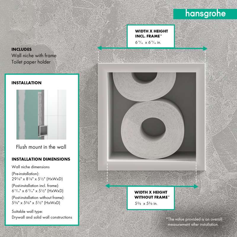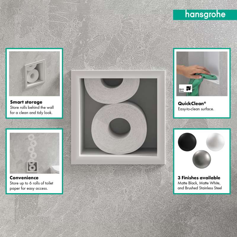 Elevate your bathroom with the hansgrohe XtraStoris Original Recessed Toilet Paper Holder with Storage & Tileable Door in Matte White, a sophisticated fusion of functionality and style. This innovative accessory not only holds your toilet paper discreetly but also offers a hidden storage solution with its tileable door, seamlessly integrating into your bathroom's aesthetic. The matte white finish adds a touch of modern elegance while being easy to maintain, ensuring enduring beauty. Designed for wet areas, it's built to withstand moisture and daily use, with an included easy-to-install waterproof kit. Upgrade your bathroom with the hansgrohe XtraStoris collection and experience a perfect blend of practicality and contemporary design.