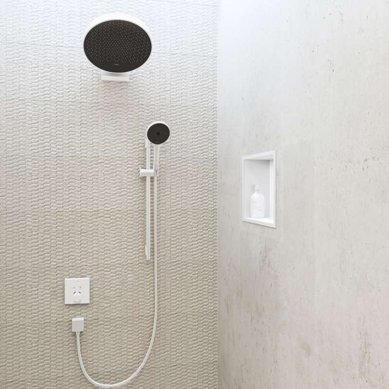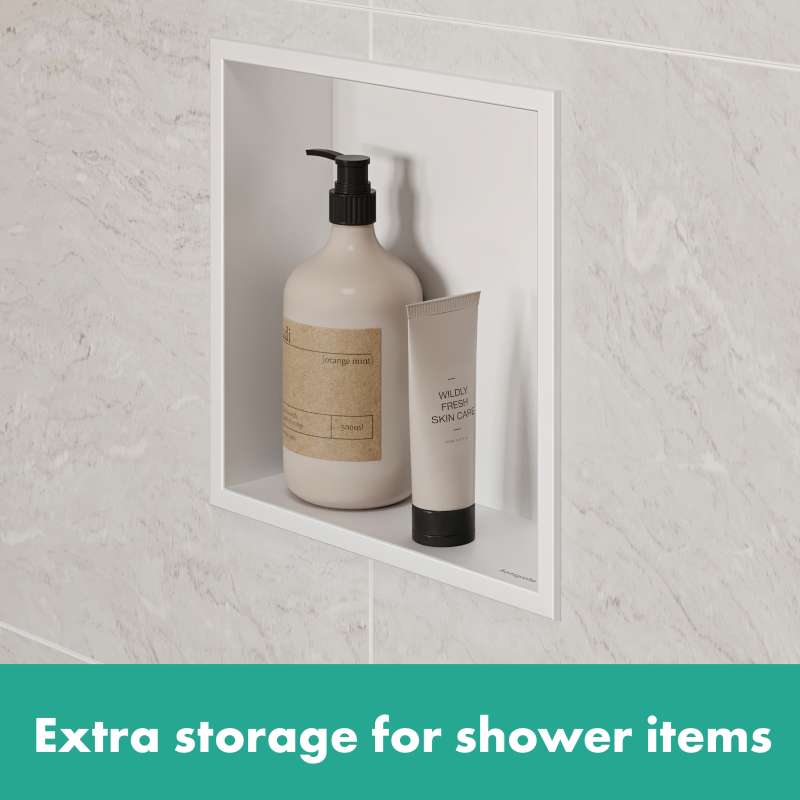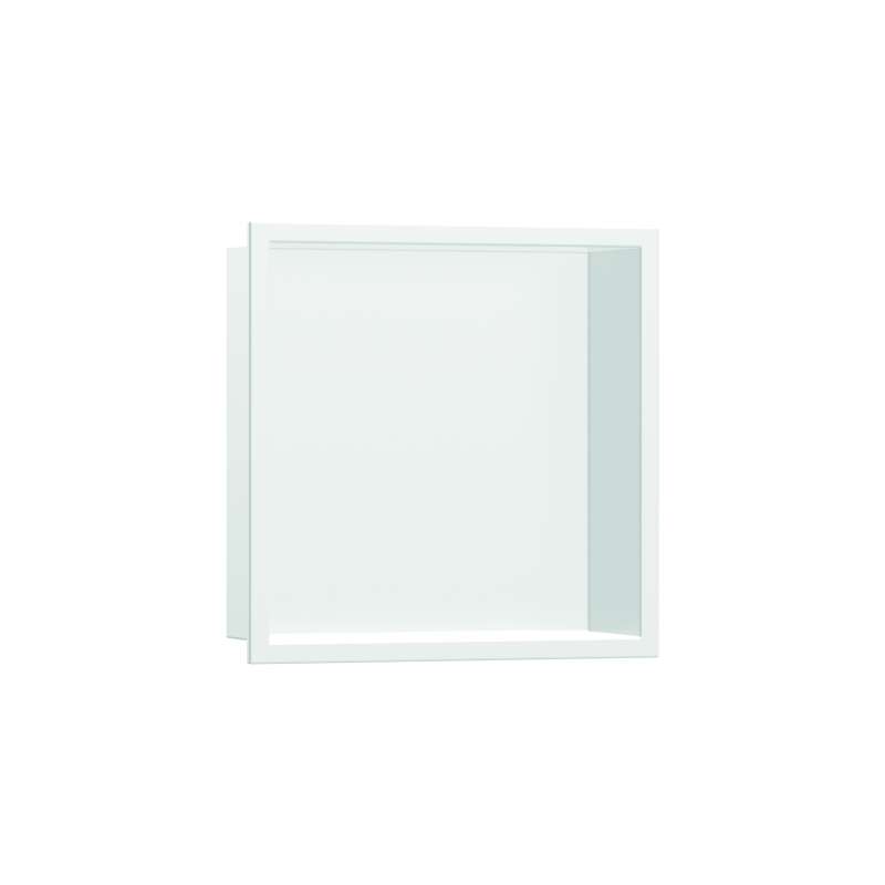 Design shelf for the wet area: hansgrohe XtraStoris original wall niche in matte white with integrated frame The XtraStoris original wall niche 12 x 12 x 4 in in matte white from hansgrohe is your modern shelving solution for that perfectly contemporary shower area. At a width of 6 in, the shelf offers extra space for personal care products. At the same time, the wall-integrated installation ensures more elbow room in the shower. The matte white finish gives the wall niche a unique look. In combination with its frame, which is seamlessly curved from the high-quality stainless steel body, the shelf becomes a formative design element in the bathroom: as an expressive contrasting element or ideal companion for hansgrohe FinishPlus products - for that uniform bathroom design. The matte white body with integrated frame and a waterproof installation and sealing set designed specifically for the shower area are included in the box. This makes it easy and safe to install. The matte white finish is easy to clean and retains its beauty permanently.