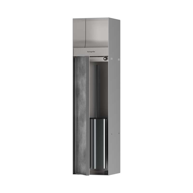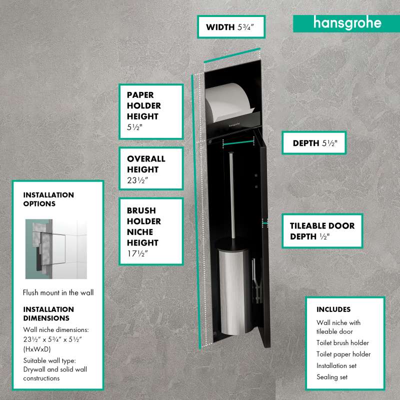Almost invisible: Brushed stainless steel built-in wall niche for storing toilet brush and paper roll The XtraStoris Rock built-in wall niche for storing toilet brush and toilet rolls from hansgrohe is the elegant solution for a harmoniously designed bathroom. Thanks to the tileable door, the wall niche can be perfectly matched to the bathroom design. Almost invisible recessed into the wall, the frameless shelf provides a tidy and quiet area around the bathroom. With its dimensions of 27 x 9 x 5.5 in (H x W x D), the wall niche provides storage space for the toilet brush and a paper roll. The brushed stainless steel body makes it a modern eye-catcher even when the door is open. Waterproof installation and seal set especially designed for wet areas Push-to-open function: convenient and hygienic use - the door opens with a simple tap. The brushed stainless steel finish is easy to clean and stays beautiful.