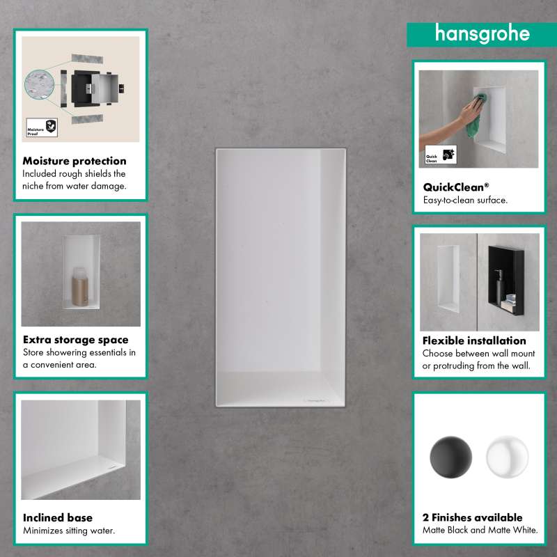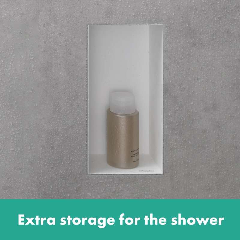 Modern and safe: frameless hansgrohe XtraStoris wall niche in matte white for the shower area. The XtraStoris Minimalistic wall niche 12 x 6 x 4 in in matte white from hansgrohe is your stylish shelving solution for the modern wet area. With a width of 6 in, the wall-integrated shelf offers extra space for personal care products. The combination of matte white finish and frameless design underscores the minimalist effect of the wall niche. For a clear appearance and plenty of freedom of movement, the shelf can be integrated flush with the tile in the wall. Alternatively, the body can be installed at a distance of up to 2.1 in out of the wall. That makes the shelf a formative design element, especially in the modern bathroom, and the ideal companion for hansgrohe FinishPlus products. The result is an exclusive and uniform bathroom design. Included in the box are the matte white body and a waterproof installation and seal set specially designed for the shower area. This makes it easy and safe to install. For an accurate flush installation or the variant that has up to 2.1 in protrusion, the mounting set contains suitable supporting rails. The matte white finish is easy to clean and retains its beauty permanently.
