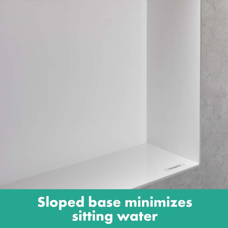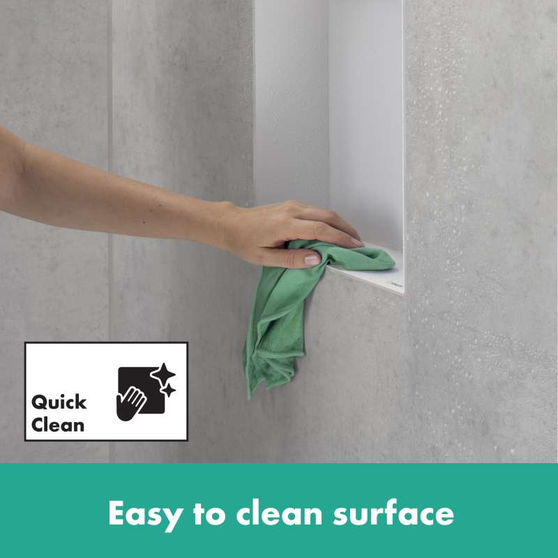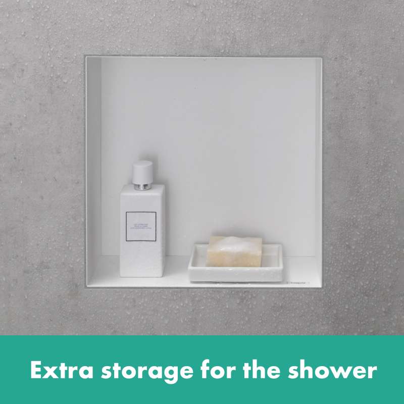 Modern and safe: frameless hansgrohe XtraStoris wall niche in brushed stainless steel for the shower area. The XtraStoris Minimalistic wall niche 12 x 12 x 4 in in brushed stainless steel from hansgrohe is your stylish shelving solution for the modern wet area. With a width of 6 in, the wall-integrated shelf offers extra space for personal care products. The combination of brushed stainless steel finish and frameless design underscores the minimalist effect of the wall niche. For a clear appearance and plenty of freedom of movement, the shelf can be integrated flush with the tile in the wall. Alternatively, the body can be installed at a distance of up to 2.1 in out of the wall. That makes the shelf a formative design element, especially in the modern bathroom, and the ideal companion for hansgrohe FinishPlus products. The result is an exclusive and uniform bathroom design. Included in the box are the brushed stainless steel body and a waterproof installation and seal set specially designed for the shower area. This makes it easy and safe to install. For an accurate flush installation or the variant that has up to 2.1 in protrusion, the mounting set contains suitable supporting rails. The brushed stainless steel finish is easy to clean and retains its beauty permanently.