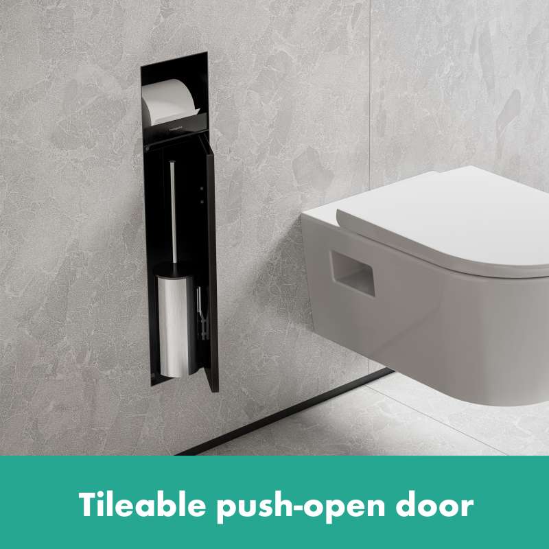 Uniform look: hansgrohe XtraStoris Rock wall niche for the shower area with tiled door. The XtraStoris Rock niche 12 x 12 x 4 in with tiled door from hansgrohe is the modern and flexible shelf solution for a sophisticated shower area. Thanks to its tiled door, the wall niche can be perfectly adapted to the bathroom design. Inconspicuously integrated, the shelf helps create a larger and calmer bathroom. With dimensions of 12 x 12 x 4 in (H x W x D), it offers extra storage space for personal care products. The wall-integrated installation ensures more freedom of movement in the shower. With its brushed stainless steel body, the wall niche is itself a modern eye-catcher, even when the door is open. The box includes the brushed stainless steel body with tiled door and a waterproof installation and seal set specifically designed for the shower area. This makes it easy to install and safe to use. The push-to-open feature offers convenient use even with soapy hands: open the door with a simple tap. Quality from hansgrohe: The brushed stainless steel finish is easy to clean and retains its beauty permanently.