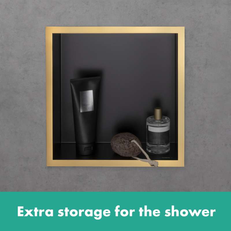 Shelf as a design highlight: hansgrohe XtraStoris individual wall niche (12 x 12 x 4 in) with bronze-colored frame. The XtraStoris individual wall niche 12 x 12 x 4 in with designer frame in brushed bronze from hansgrohe is more than just a highly functional shelf for the shower area. In fact, the brushed stainless steel body in combination with the bronze-colored frame will transform your wall niche into an absolute design highlight in a modern bathroom setting. The shelf solution for showers or bathrooms is perfectly matched to hansgrohe FinishPlus products and blends in seamlessly with the room design. The result? An exclusive, seamless bathroom design. With a size of 12 x 12 x 4 in, the shelf offers extra storage space for personal care products. At the same time, the wall-integrated installation ensures more elbow room in the shower. Included in the box is the brushed stainless steel body and a water-tight installation set especially designed for the wet area, including sealing fleece. This makes it easy to install and safe to use. Quality from hansgrohe: The surface of the body and frame is easy to clean and retains its beauty for longer.