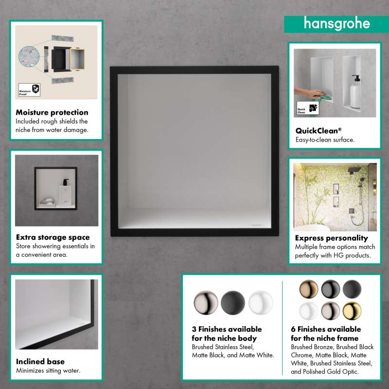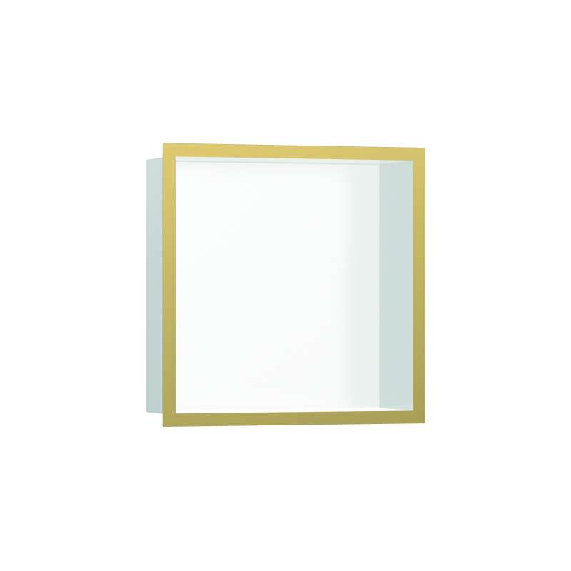Shelf as a design highlight: hansgrohe XtraStoris individual wall niche (12 x 12 x 4 in) with polished gold optic-colored frame. The XtraStoris individual wall niche 12 x 12 x 4 in with designer frame in brushed stainless steel from hansgrohe is more than just a highly functional shelf for the shower area. In fact, the brushed stainless steel body in combination with the polished gold optic-colored frame will transform your wall niche into an absolute design highlight in a modern bathroom setting. The shelf solution for showers or bathrooms is perfectly matched to hansgrohe FinishPlus products and blends in seamlessly with the room design. The result? An exclusive, seamless bathroom design. With a size of 12 x 12 x 4 in, the shelf offers extra storage space for personal care products. At the same time, the wall-integrated installation ensures more elbow room in the shower. Included in the box is the brushed stainless steel body and a water-tight installation set especially designed for the wet area, including sealing fleece. This makes it easy to install and safe to use. Quality from hansgrohe: The surface of the body and frame is easy to clean and retains its beauty for longer.