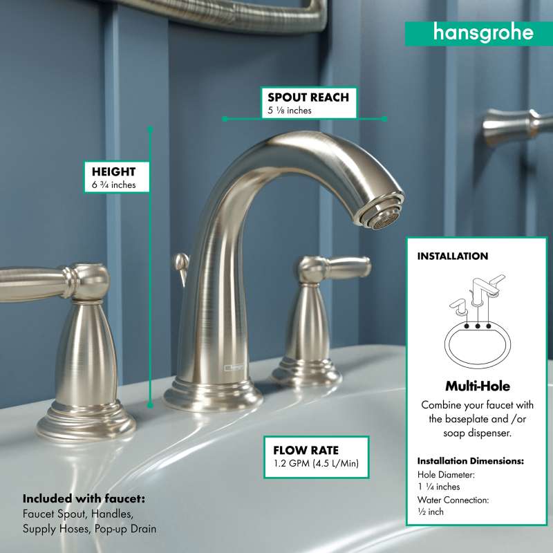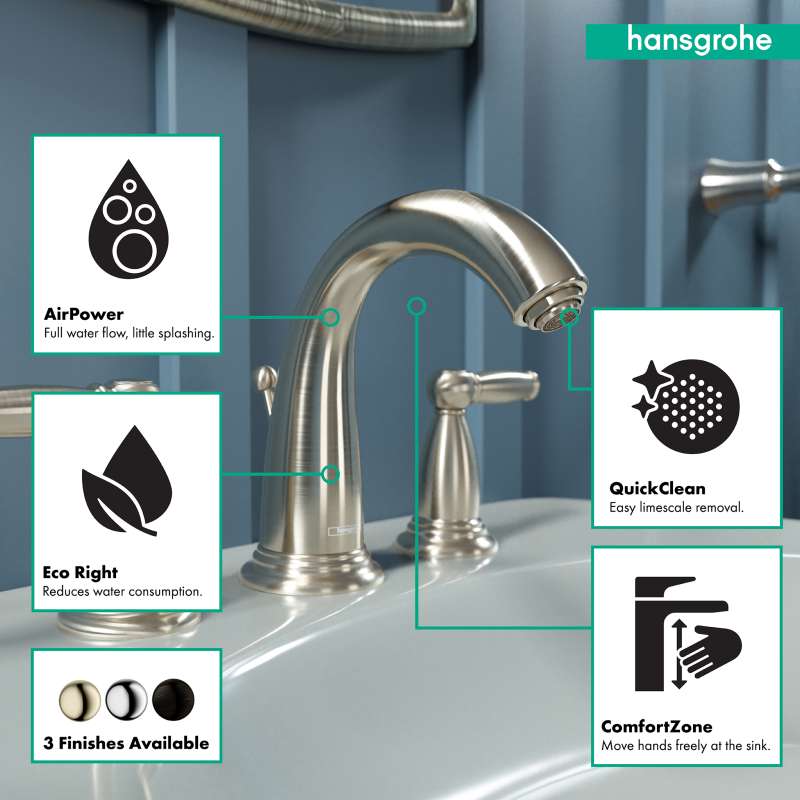 Design With a range of models and styles, paired with the quality and design you expect from hansgrohe, dream bathrooms become a reality. Bath faucets by hansgrohe exude beautiful design with superior performance and durability. Pick your desired faucet, then browse the entire product suite for complementary accessories. German engineering ensures a lifetime of consistent and dependable operation. Maintenance Products that function perfectly are essential. To ensure that they do, every hansgrohe product 100% air tested in production. hansgrohe faucets feature a silicone aerator that optimizes water flow performance, resists mineral deposit build-up, and is designed to be easily wiped clean. Installation Can be installed in existing 1 or 3 hole counter configurations. Standard 3/8-inch pipe connection hoses included (attached). Baseplate sold separately. Please comply with all local, state, and federal plumbing codes and regulations. Installation instruction link below. Customer Support customerservice@hansgrohe.com | 1 (800) 334-0455 | Limited Lifetime Warranty | Installation / User Guide / Warranty PDF links below