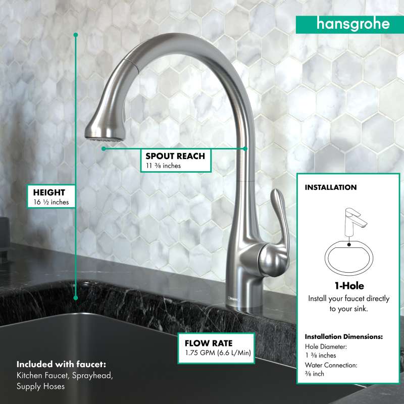 Design With a range of models and styles, paired with the quality and design you expect from hansgrohe, dream kitchens become a reality. Kitchen faucets by hansgrohe exude beautiful design, superior durability, and unique features that are intuitive to use. Pick your desired faucet, then browse the entire product suite for complementary fixtures. German engineering ensures a lifetime of consistent and dependable operation. Maintenance Products that function perfectly are essential. To ensure that they do, every hansgrohe kitchen faucet is 100% air-tested in production. The silicone aerator and spray nozzles help optimize water flow performance, resist mineral deposit build-up, and are designed to be easily wiped clean. Installation Can be installed over existing multi-hole counter configurations. Standard 3/8-inch pipe connection hoses included. Baseplate sold separately. Please comply with all local, state, and federal plumbing codes and regulations. Installation instruction link below. Customer Support customerservice@hansgrohe.com | 1 (800) 334-0455 | Limited Lifetime Warranty | Installation / User Guide / Warranty PDF links below