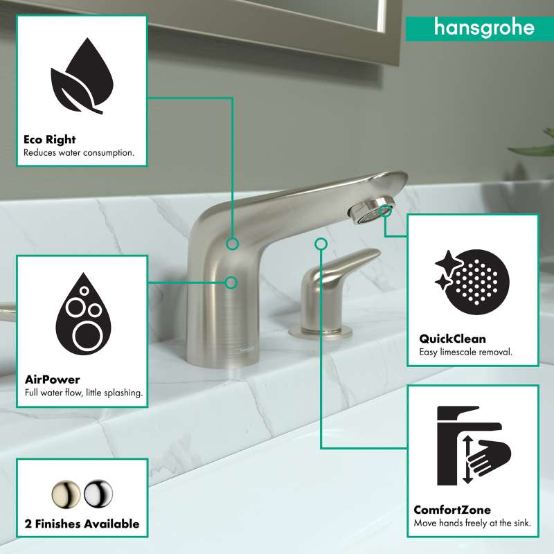 Design With a range of models and styles, paired with the quality and design you expect from hansgrohe, dream bathrooms become a reality. Bath faucets by hansgrohe exude beautiful design with superior performance and durability. Pick your desired faucet, then browse the entire product suite for complementary accessories. German engineering ensures a lifetime of consistent and dependable operation. Maintenance Products that function perfectly are essential. To ensure that they do, every hansgrohe product 100% air tested in production. hansgrohe faucets feature a silicone aerator that optimizes water flow performance, resists mineral deposit build-up, and is designed to be easily wiped clean. Installation Can be installed in existing 1 or 3 hole counter configurations. Standard 3/8-inch pipe connection hoses included (attached). Baseplate sold separately. Please comply with all local, state, and federal plumbing codes and regulations. Installation instruction link below. Customer Support customerservice@hansgrohe.com | 1 (800) 334-0455 | Limited Lifetime Warranty | Installation / User Guide / Warranty PDF links below