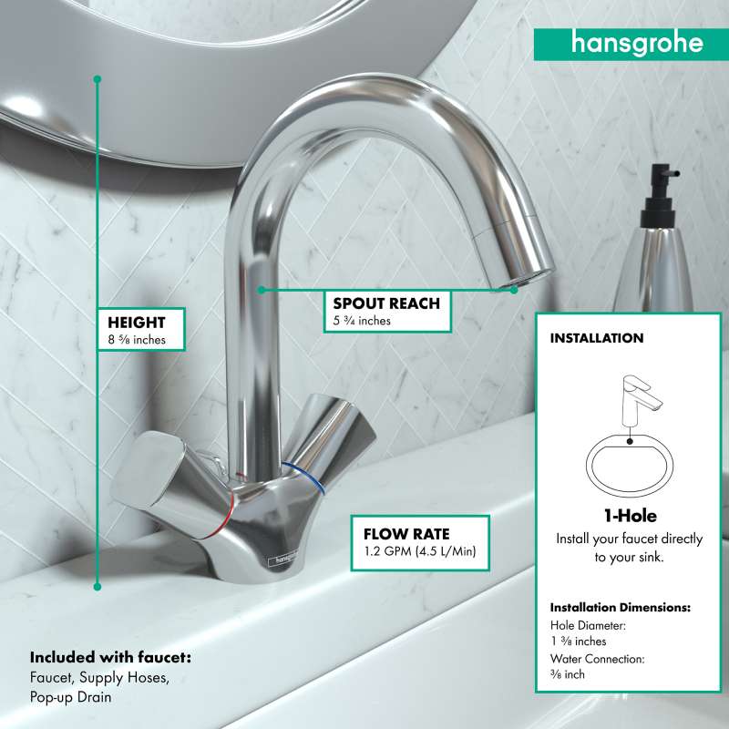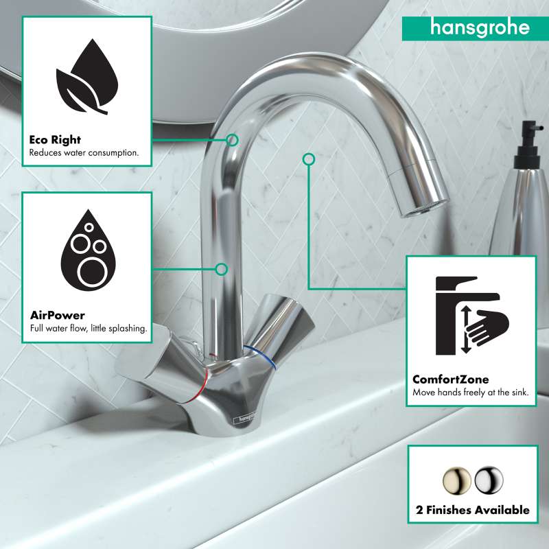 Clear lines and finely curved surfaces make Logis a real eye-catcher. The generous surfaces exude quality and make cleaning child's play. A striking feature of Logis: the ergonomically designed handle with a rounded shape . It invites you to touch and operate it. Logis fixtures are equipped with EcoRight technology to ensure that not only the purchase but also the operation costs are reduced. This protects the environment and your wallet. Hansgrohe AirPower also ensures responsible use of water resources . This mixes air into the water, increasing its efficiency and also your water enjoyment. Transform the space between the spout and the sink into your ComfortZone. Logis bathroom faucets are available in different heights so that you can adjust them perfectly to your sink. This avoids splashes and gives you room to move.