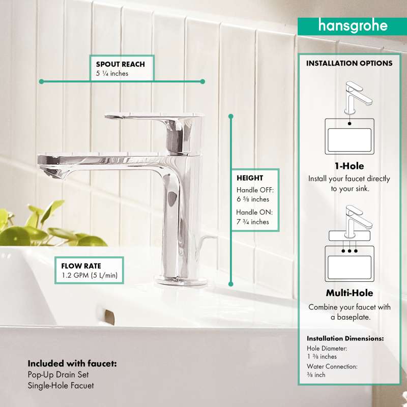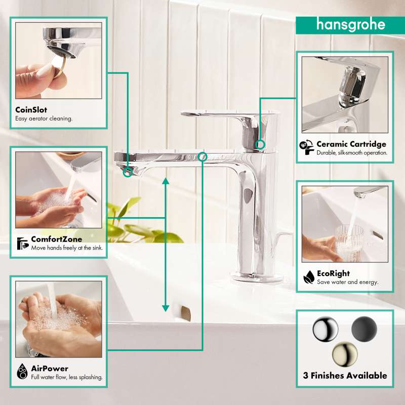 Quality that suits your style: Rebris S bathroom faucet with pop-up drain. With its timeless, sleek design, the Rebris S 110 bathroom faucet with pop-up drain will visibly enhance your bathroom. The sleek, rounded shapes and precision surfaces create an atmosphere of well-being. Rebris S includes modern designer faucets at a fair price. Make your own dream bathroom a reality. The renowned hansgrohe quality brings the promises of a winning design to life: A high-quality ceramic valve system controls the water volume and temperature. This keeps working smoothly and reliably even after frequent use. Thanks to innovative hansgrohe technology, the faucet helps to save water also: even at high water pressure, there is a max. flow of 1.2 GPM. For a full water jet, the single lever faucet enriches the water with air (AirPower). This creates a soft jet that splashes less - meet the beauty of water. The included pop-up drain can be easily opened and closed using one hand. This makes it Easy to operate the waste plug without having to reach into the water. The faucet is even suitable for hard water. The aerator can be removed for cleaning and descaled using a coin. No tools needed. This keeps the faucet looking like new.