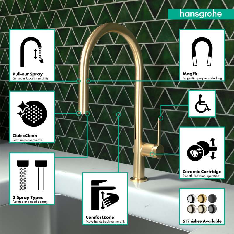 - Magnetic holder: the pull-out shower head is held securely and in the middle of the spout (hansgrohe MagFit)