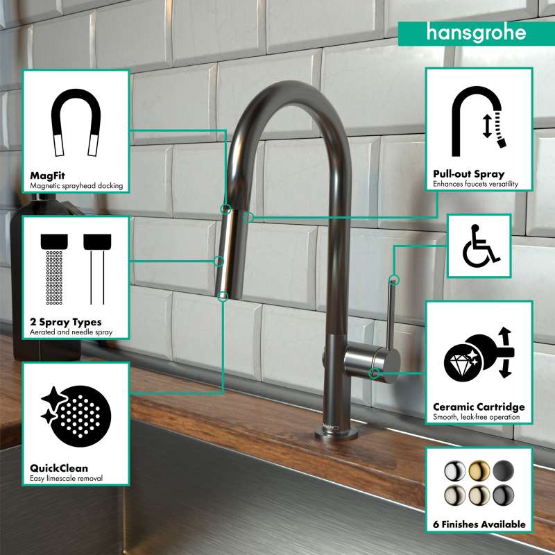- Magnetic holder: the pull-out shower head is held securely and in the middle of the spout (hansgrohe MagFit)