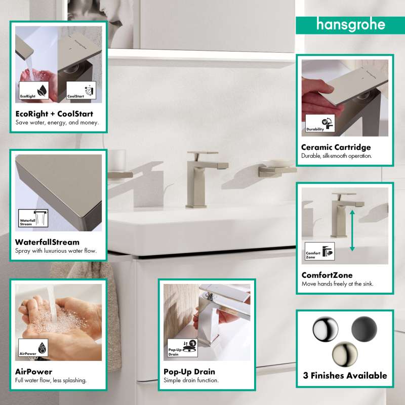 The Tecturis E 110 single lever faucet with CoolStart and drain assembly turns water into an experience. Give water a striking shape with the compact Tecturis E 110 CoolStart bathroom faucet from hansgrohe. Tecturis E impresses with a purist design that has clear lines and geometric shapes. At the same time, the bathroom faucet combines an attractive appearance with maximum comfort. This turns the use of water into a new aesthetic experience every day. The water is enriched with air, giving fewer water splashes and an incomparably pleasant feeling on the skin. The extra wide spray looks like a small waterfall and suits the cubic design well (WaterfallStream). When the lever is in the middle position, only cold water flows. If it is deliberately turned left, hot water is added (CoolStart).
