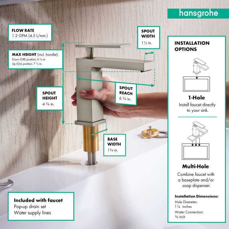- Included in box: Single lever bathroom faucet, connection hoses, mounting hardware, assembly instructions
