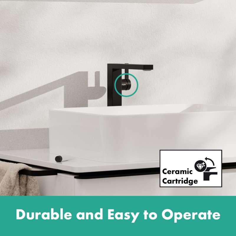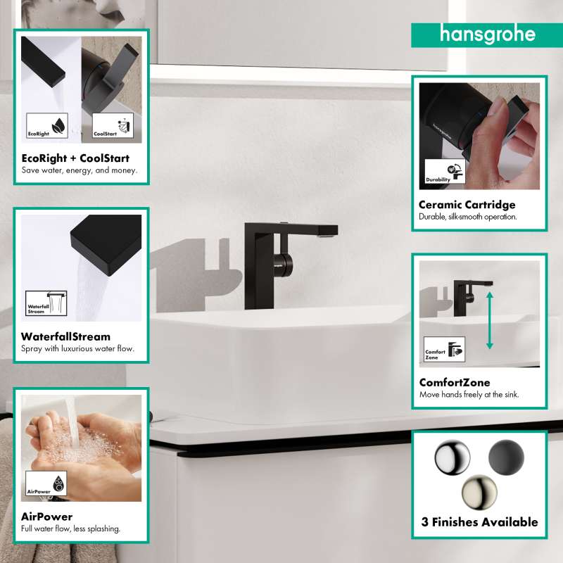 The Tecturis E 240 Fine single lever faucet with CoolStart and drain assembly turns water into an experience. Give water a striking shape with the compact Tecturis E 240 Fine CoolStart bathroom faucet from hansgrohe. Tecturis E impresses with a purist design that has clear lines and geometric shapes. At the same time, the bathroom faucet combines an attractive appearance with maximum comfort. This turns the use of water into a new aesthetic experience every day. Convenient: the lever placement reduces water drops and limescale on the faucet. The water is enriched with air, giving fewer water splashes and an incomparably pleasant feeling on the skin. The extra wide spray looks like a small waterfall and suits the cubic design well (WaterfallStream). If the lever is pointing upwards, only cold water flows. If it is deliberately turned down, hot water is added (CoolStart).