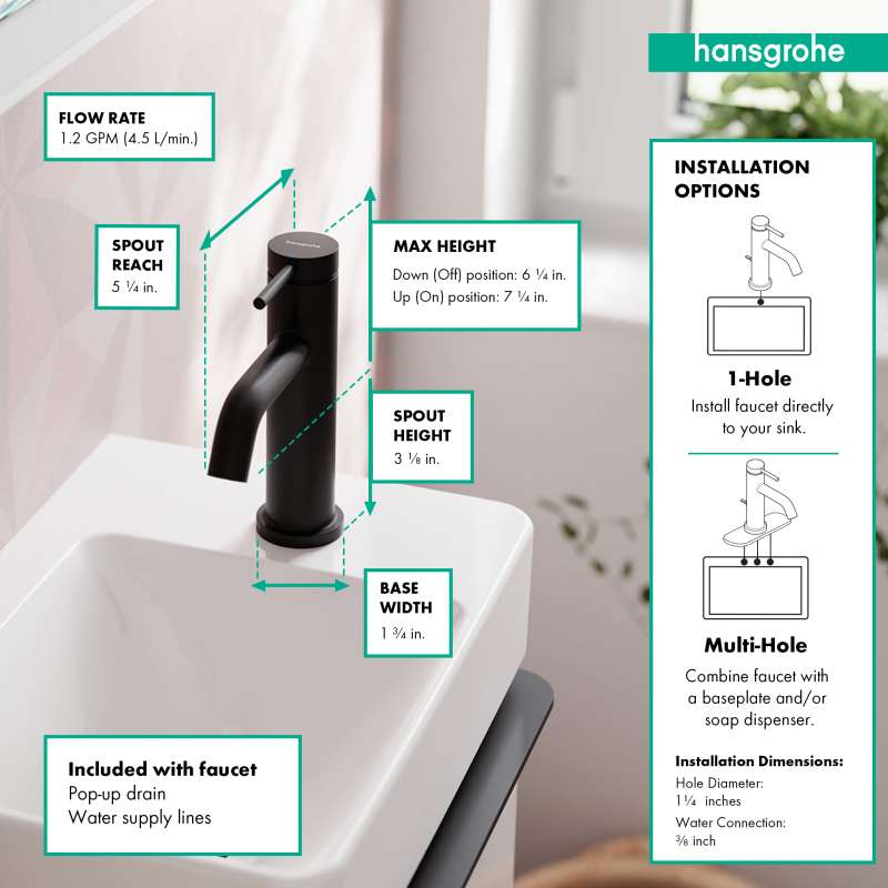 The Tecturis S 80 single lever faucet with CoolStart and drain assembly turns water into an experience. Give water a striking shape with the compact Tecturis S 80 CoolStart bathroom faucet from hansgrohe. Tecturis S impresses with a purist design that has clear lines and rounded shapes. At the same time, the bathroom faucet combines an attractive appearance with maximum comfort. This turns the use of water into a new aesthetic experience every day. The water is enriched with air, giving fewer water splashes and an incomparably pleasant feeling on the skin. The extra wide spray looks like a small waterfall and suits the cubic design well (WaterfallStream). When the lever is in the middle position, only cold water flows. If it is deliberately turned left, hot water is added (CoolStart).