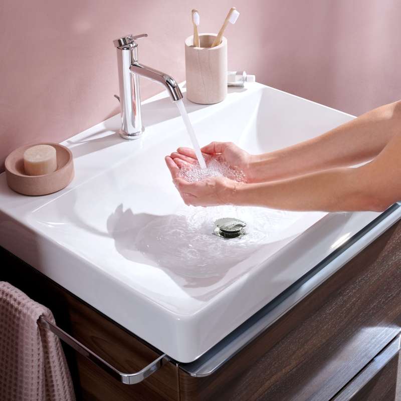 The Tecturis S 110 single lever faucet with CoolStart and drain assembly turns water into an experience. Give water a striking shape with the compact Tecturis S 110 CoolStart bathroom faucet from hansgrohe. Tecturis S impresses with a purist design that has clear lines and rounded shapes. At the same time, the bathroom faucet combines an attractive appearance with maximum comfort. This turns the use of water into a new aesthetic experience every day. The water is enriched with air, giving fewer water splashes and an incomparably pleasant feeling on the skin. The extra wide spray looks like a small waterfall and suits the cubic design well (WaterfallStream). When the lever is in the middle position, only cold water flows. If it is deliberately turned left, hot water is added (CoolStart).