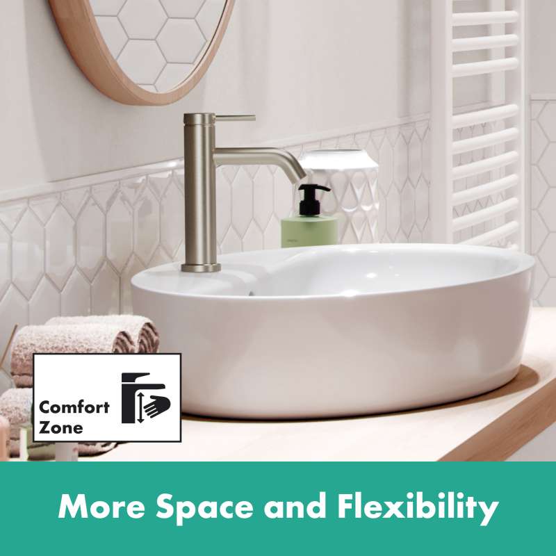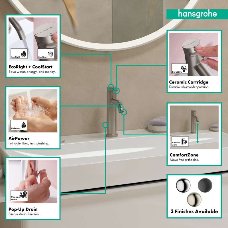 The Tecturis S 110 single lever faucet with CoolStart and drain assembly turns water into an experience. Give water a striking shape with the compact Tecturis S 110 CoolStart bathroom faucet from hansgrohe. Tecturis S impresses with a purist design that has clear lines and rounded shapes. At the same time, the bathroom faucet combines an attractive appearance with maximum comfort. This turns the use of water into a new aesthetic experience every day. The water is enriched with air, giving fewer water splashes and an incomparably pleasant feeling on the skin. The extra wide spray looks like a small waterfall and suits the cubic design well (WaterfallStream). When the lever is in the middle position, only cold water flows. If it is deliberately turned left, hot water is added (CoolStart).