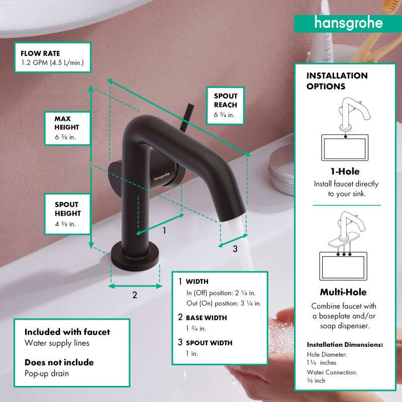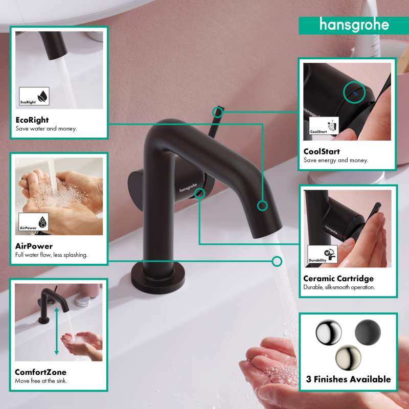 The Tecturis S 110 Fine single lever faucet with CoolStart and drain assembly turns water into an experience. Give water a striking shape with the compact Tecturis S 110 Fine CoolStart bathroom faucet from hansgrohe. Tecturis E impresses with a purist design that has clear lines and rounded shapes. At the same time, the bathroom faucet combines an attractive appearance with maximum comfort. This turns the use of water into a new aesthetic experience every day. Convenient: the lever placement reduces water drops and limescale on the faucet. The water is enriched with air, giving fewer water splashes and an incomparably pleasant feeling on the skin. The extra wide spray looks like a small waterfall and suits the cubic design well (WaterfallStream). If the lever is pointing upwards, only cold water flows. If it is deliberately turned down, hot water is added (CoolStart).