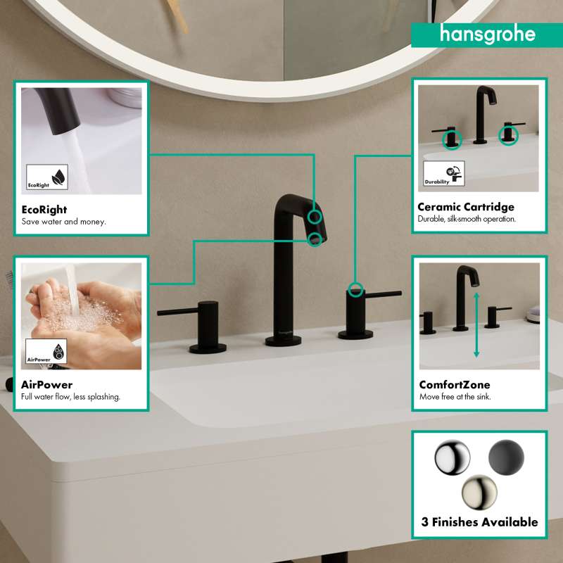 The Tecturis S 150 widespread faucet turns water into an experience. Give water a striking shape with the compact Tecturis S 150 bathroom faucet from hansgrohe. Tecturis S impresses with a purist design that has clear lines and rounded shapes. At the same time, the bathroom faucet combines an attractive appearance with maximum comfort. This turns the use of water into a new aesthetic experience every day. The water is enriched with air, giving fewer water splashes and an incomparably pleasant feeling on the skin.