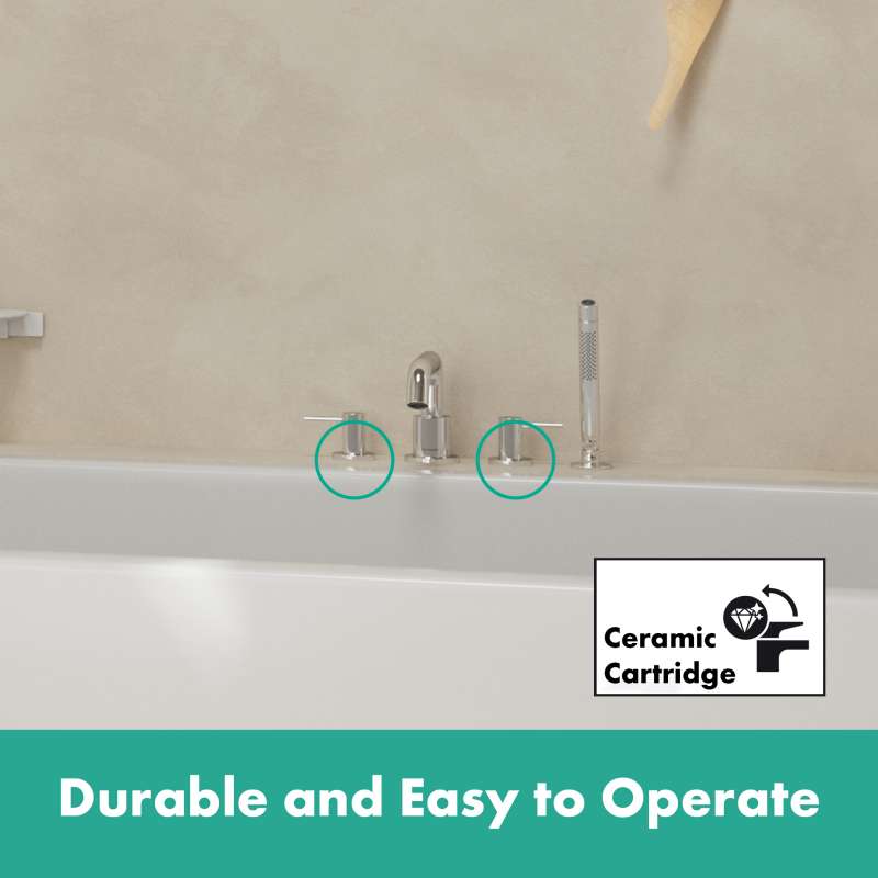 Turn water into an experience with the Tecturis S 4-hole tub filler. Give water a striking shape with the Tecturis S 4-hole roman tub filler from hansgrohe. Tecturis S impresses with a purist design that has clear lines and rounded shapes. At the same time, the tub filler combines a strong appearance with maximum comfort. This turns the use of water into a new aesthetic experience every day. The hansgrohe AirPower technology, which enriches the water jet with air, is a joy to use. This is what creates hansgrohe's incomparably pleasant feeling of water on the skin. There is also less splashing. The broad range of Tecturis S products makes your own dream bathroom a reality. The included handheld shower head with PowderRain lets users be pampered by micro-fine droplets in an immersive shower experience. The adjustable temperature limitation feature protects against excessively hot water. The tub filler will also need a rough for the installation (#06646000) - sold separately.