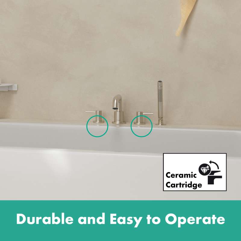 Turn water into an experience with the Tecturis S 4-hole tub filler. Give water a striking shape with the Tecturis S 4-hole roman tub filler from hansgrohe. Tecturis S impresses with a purist design that has clear lines and rounded shapes. At the same time, the tub filler combines a strong appearance with maximum comfort. This turns the use of water into a new aesthetic experience every day. The hansgrohe AirPower technology, which enriches the water jet with air, is a joy to use. This is what creates hansgrohe's incomparably pleasant feeling of water on the skin. There is also less splashing. The broad range of Tecturis S products makes your own dream bathroom a reality. The included handheld shower head with PowderRain lets users be pampered by micro-fine droplets in an immersive shower experience. The adjustable temperature limitation feature protects against excessively hot water. The tub filler will also need a rough for the installation (#06646000) - sold separately.