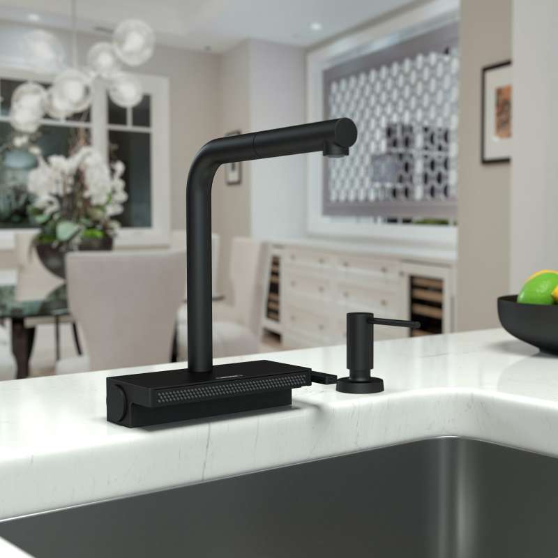 The Aquno Select kitchen faucet features a linear look with its L-shaped spout. The angled spout highlights the precise angles of the overall design, so it can be perfectly matched with your cabinets and other interior design elements. The Aquno Select's spout features a pull-out function with laminar spray. It is easy to switch to the flat SatinFlow spray with the simple touch of the Select button on the faucet's base. The included sBox - the hose extension with safe storage under the sink - allows for a larger working radius.