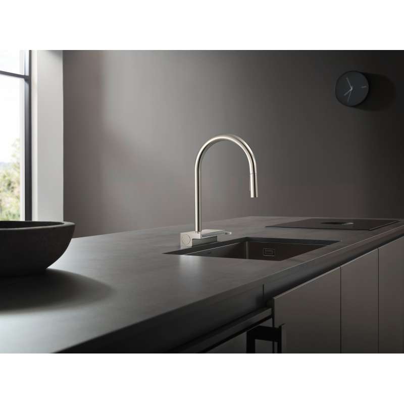 The striking high arc spout stands out and emphasises the synergy between angles and curves. The adjustment on the pull-out spout guarantees the spray type that's right for your project. Simply switch between the laminar and shower spray using the lockable button. With the Select function on the faucet's base, a simple touch of a button is all it takes to switch to the flat, gentle vegetable shower. The faucet also features a single-lever handle on the side for turning the water on and off and controlling the temperature. The included sBox makes it easy to pull out the hose, which is safely retracted and stored under the sink after use. The high arc spout boasts a radius that can be set to prevent it swivelling beyond the sink.