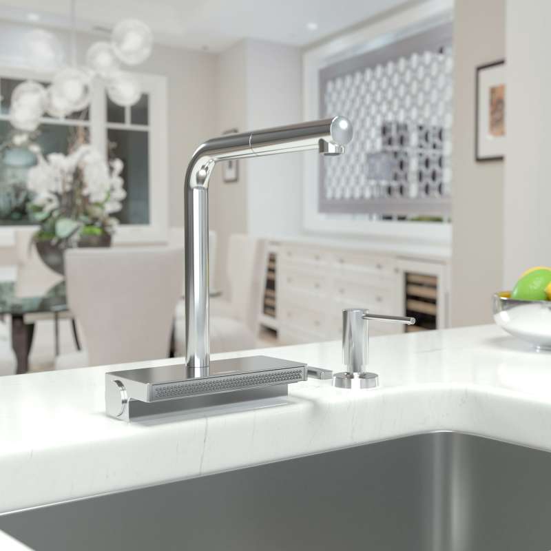 The Aquno Select kitchen faucet features a linear look with its L-shaped spout. The angled spout highlights the precise angles of the overall design, so it can be perfectly matched with your cabinets and other interior design elements. The Aquno Select's spout features a pull-out function with laminar spray. It is easy to switch to the flat SatinFlow spray with the simple touch of the Select button on the faucet's base.