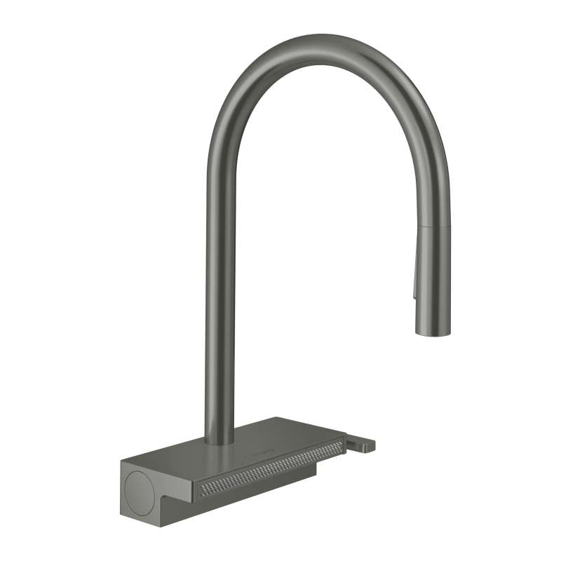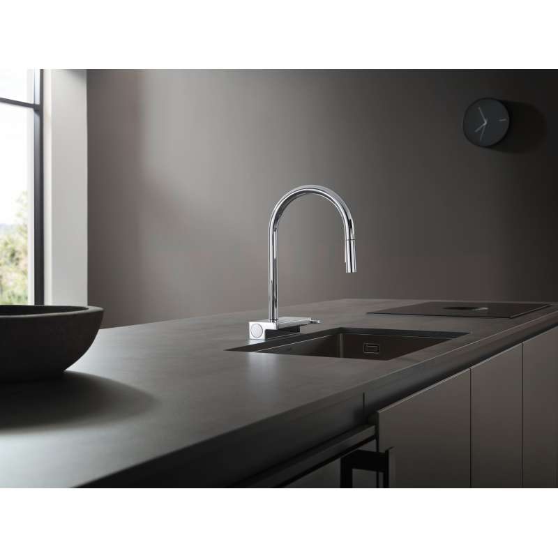 The striking high arc spout stands out and emphasises the synergy between angles and curves. The adjustment on the pull-out spout guarantees the Spray type that's right for your project. Simply switch between the laminar and shower spray using the lockable button. With the Select function on the faucet's base, a simple touch of a button is all it takes to switch to the flat, gentle vegetable shower. The faucet also features a single-lever handle on the side for turning the water on and off and controlling the temperature. The high arc spout boasts a radius that can be set to prevent it swivelling beyond the sink.