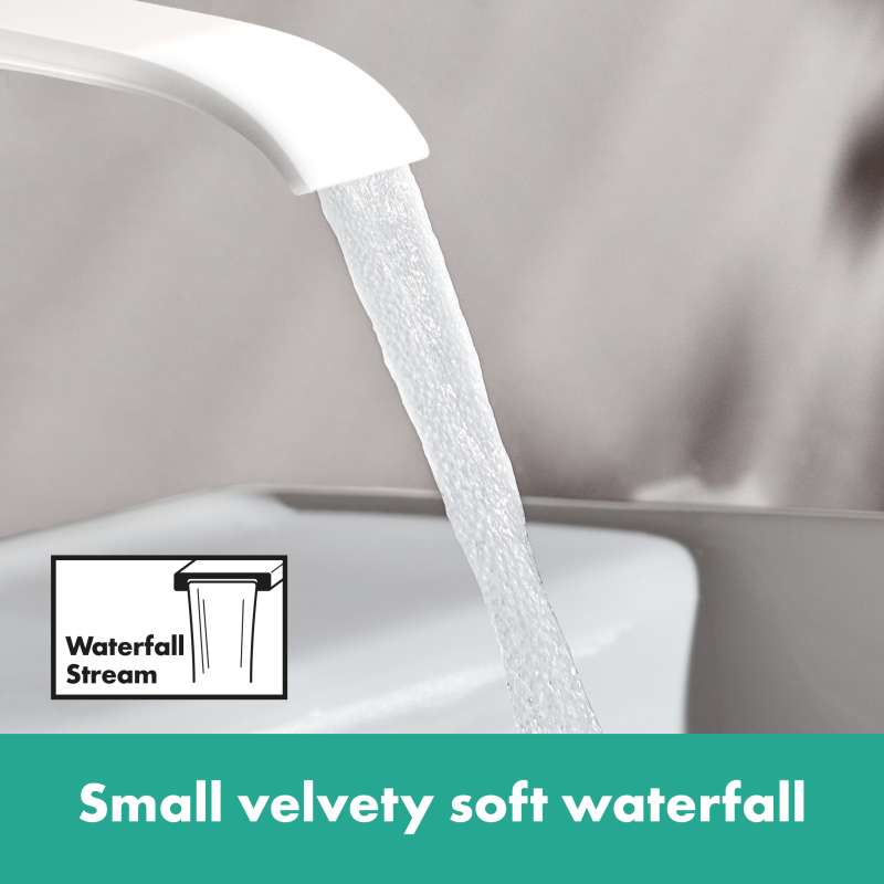 For feel-good moments: Elegant single-lever faucet with extra wide water jet. The Vivenis single-lever bathroom faucet 80 transforms time at the sink into a ritual of well-being. The gentle stream of water flows like a small waterfall from the extra wide spout and creates a completely new feeling of water (WaterfallStream). Air-enriched drops wet hands and face softly. In combination with the elegantly curved design of the faucet and the excellent workmanship in proven hansgrohe quality, the bathroom becomes a place of rest. Details such as the reduced handle design and the lever that is opposite to the hand make it clear: at hansgrohe people are at the center of attention. The handle has no play even after frequent use and controls the high-quality ceramic mixing system from hansgrohe. With a distance of 3.2 in between spout and bathroom sink, the single-lever faucet offers plenty of freedom of movement. The expressive surface in matte white is easy to clean and remains permanently beautiful.