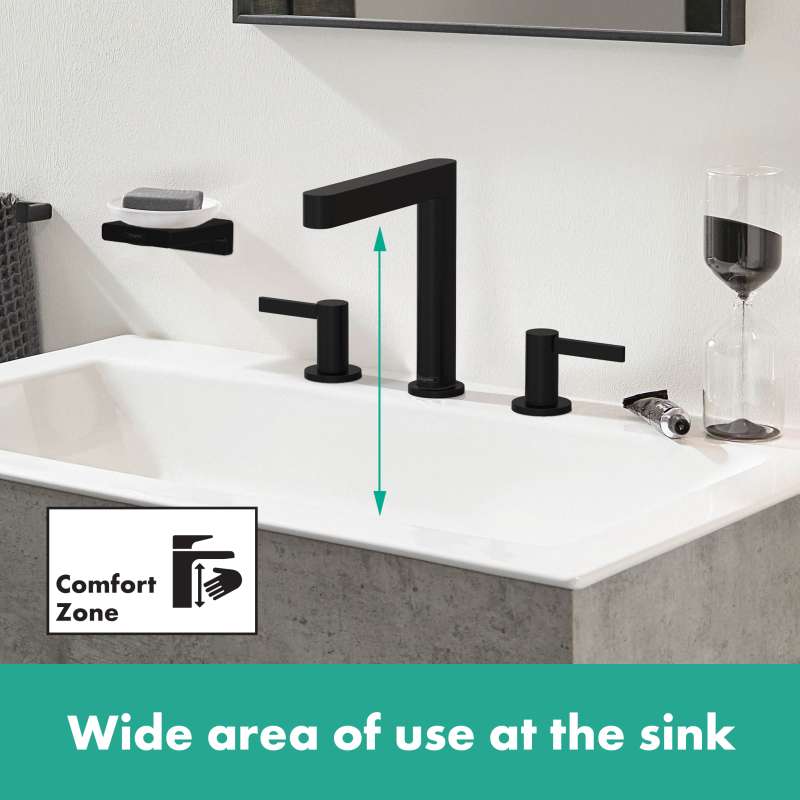 Modern 3-hole faucet in matte black for a puristic bathroom ambience - includes push-open drain The Finoris 160 3-hole bathroom faucet in matte black with push-open drain assembly from hansgrohe interprets the classic operating concept surprisingly new and modern via two wing handles. The slim, geometric shapes fit particularly well into a puristic bathroom ambience. There, the faucet sets an expressive accent with its Easy-to-clean surface in matte black. The high quality faucet keeps what the Elegant design promises. The two wing handles control high-quality ceramic valves from hansgrohe. The amount and temperature of the water are reliably adjusted. The quiet and crystal clear laminar spray continues the slim fitting body and forms a harmonious unit. Thanks to hansgrohe EcoRight technology, the faucet helps save water. It uses a maximum of 1.2 GPM - even at high water pressure. The sink is the heart of the bathroom. Here, the high spout simplifies with approx. 6 in. distance from the aink for many everyday tasks (ComfortZone 160). Whether it is filling large vessels or washing hair quickly under the faucet, the Finoris 3-hole bathroom faucet 160 supports confidently. Push-open drain included. The included push-open drain fitting is operated without a pull rod. A short finger pressure on the drain plug opens or closes the valve. Without the pull rod on the back, the faucet looks even more puristic.
