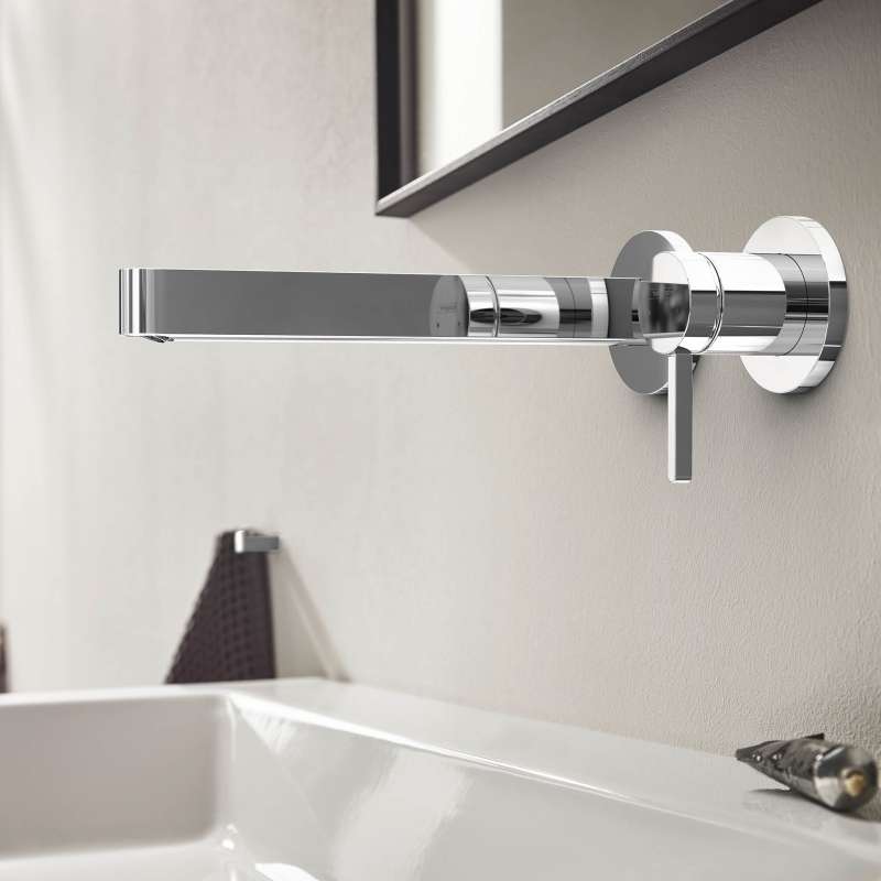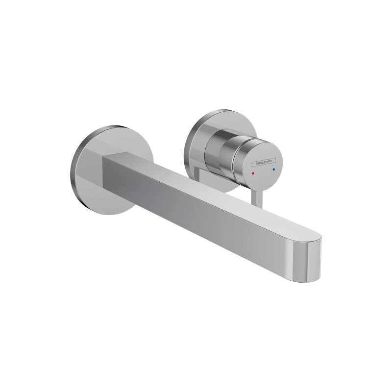 Slim design single lever mixer faucet for wall mounting The Finoris 2-hole wall-mounted bathroom faucet from hansgrohe stands out: thanks to its sleek, geometric shape and clever Installation in the wall. This creates more space around the sink and can also be combined well with a free-standing vessel sink. The minimalist design sets an expressive accent in the bathroom. The high quality faucet keeps what the elegant shape promises. The pin handle controls a smooth-running ceramic mixing system from hansgrohe. It reliably regulates water quantity and temperature with one hand. The quiet and crystal clear laminar spray continues the slim fitting body and forms a harmonious unit. Thanks to hansgrohe EcoRight technology, the fuacet designr is particularly water-saving. It uses a maximum of 1.2 GPM - even at high water pressure. Drain fitting included. The included non-locking drain fitting is used for sinks and washbasins without overflow. It prevents water from overflowing. More flexibility in bathroom design: the handle can be placed either on the right or left. Depending on how the base body is mounted in the wall.