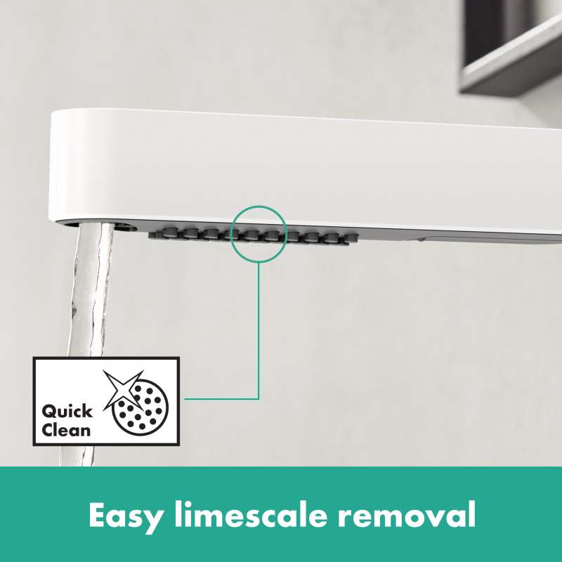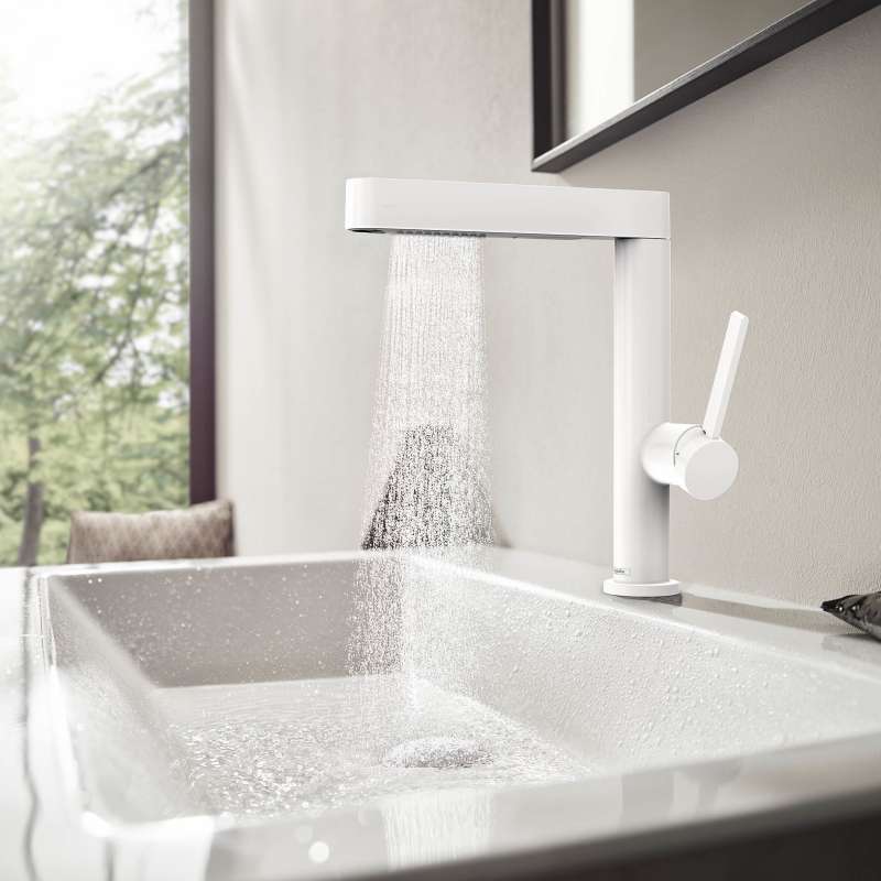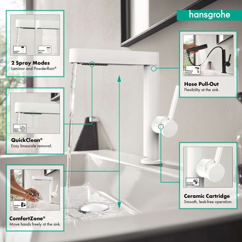 Flexible design tap in matte white with pull-out spray The Finoris 230 single-lever bathroom faucet in matte white with pull-out spray from hansgrohe impresses with a sleek, geometric design and numerous comfort functions. The sink is the heart of the bathroom. Here life is often turbulent and always poses new requirements. This faucet allows the spout to be flexibly pulled out to a length of up to 19 in. At the touch of a button, the hansgrohe Select button switches from the crystal clear laminar spray to the PowderRain spray type. This helps with quick hair washing under the faucet, bathing a baby, rinsing the sink and much more. Thanks to the built-in reset, the laminar spray is automatically selected again after switching off the faucet, preventing surprises. Form and function in harmony The puristic design sets an expressive accent in the bathroom with the easy-to-clean surface in matte white. Longer like new: limescale residue is simply wiped off by the flexible silicone nozzles of the shower head (QuickClean). Push-open drain included. The included push-open drain fitting is operated without a pull rod. A short finger pressure on the drain plug opens or closes the valve. Without the pull rod on the back, the faucet looks even more puristic.