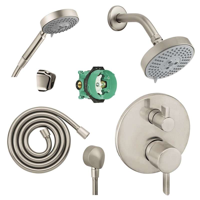 - Includes showerhead, thermostatic trim with diverter and rough, handheld shower, holder, wall outlet, 63-in hose, and 6-in shower arm with flange