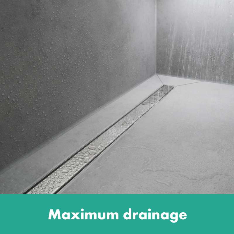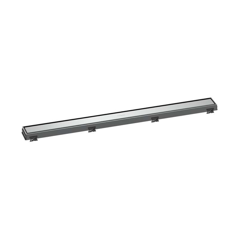 The RainDrain Match 31 1/2" drain trim (finish set) in chrome from hansgrohe is a flexible drainage solution for installation flush with the back wall or freestanding in the shower area. With its chrome surface finish, the drain trim is suitable for modern as well as classic bathroom designs. Alternatively, the channel can be tiled at the back also (max. tile thickness 18 mm). The vertically adjustable frame offers flexibility in the drain barrier also: so the system can be adjusted to the height of the tiles - for floor-level installation without trip hazard. The result meets the requirements of a barrier-free shower area. The innovative high-tech silicone membrane also ensure that hair and dirt do not get stuck. This helps prevent annoying blockages in the drain. It is easy: They are installed on a complete set with pre-assembled sealing fleece (sold separately).