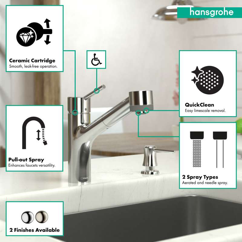 Are you looking for an excellent kitchen helper that combines modern design and many functional details at the sink? The hansgrohe Talis S kitchen faucet range blends in perfectly with any kitchen and is available in different versions - from the basic model right up to faucets with high swivel spouts and hand sprays. Talis faucets are high-quality in form and function. Their conical basic shape gives them an elegant look. And the large areas with their precise transitions are Easy to clean. And if you simply rub the QuickClean silicone inserts on the faucet spout with your finger, limescale has no chance. Your kitchen faucet will be gleaming as good as new in no time. The MagFit magnetic holder fixes the hand spray securely in place on the middle of the spout after use.